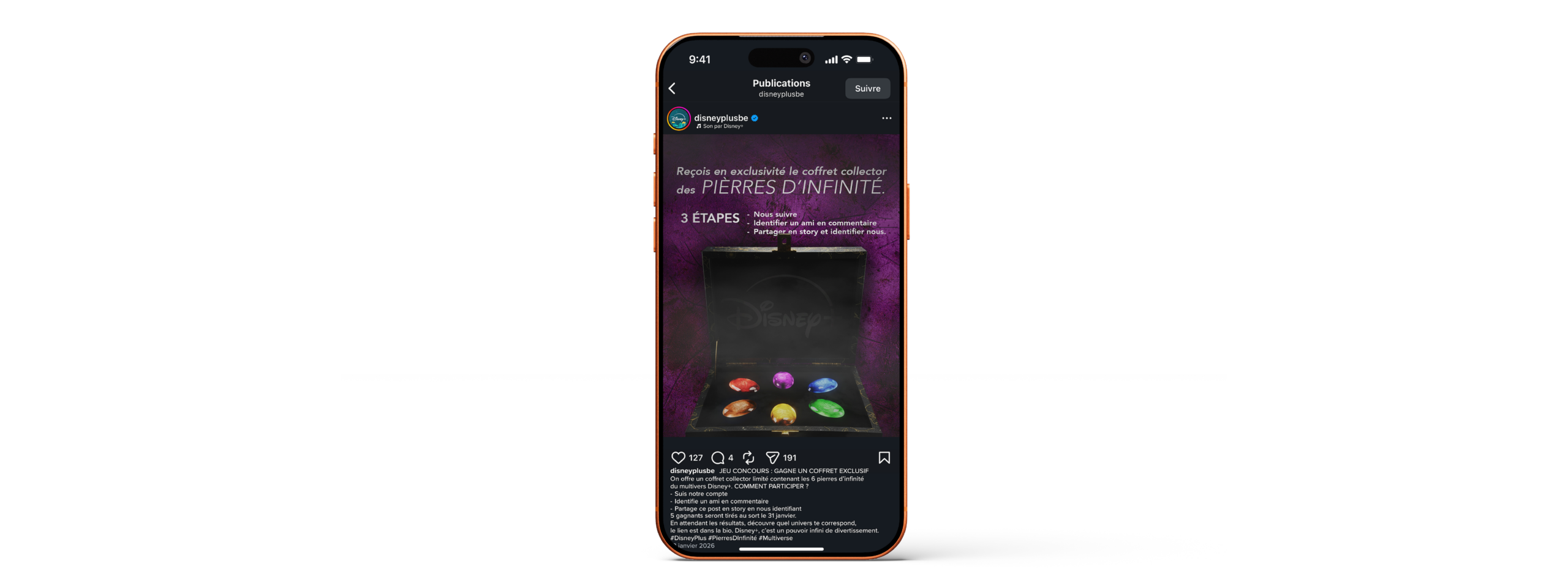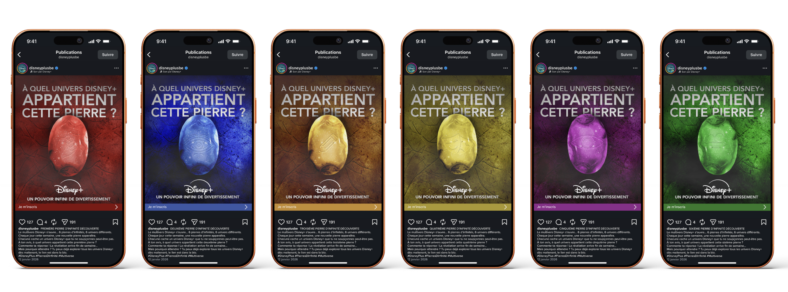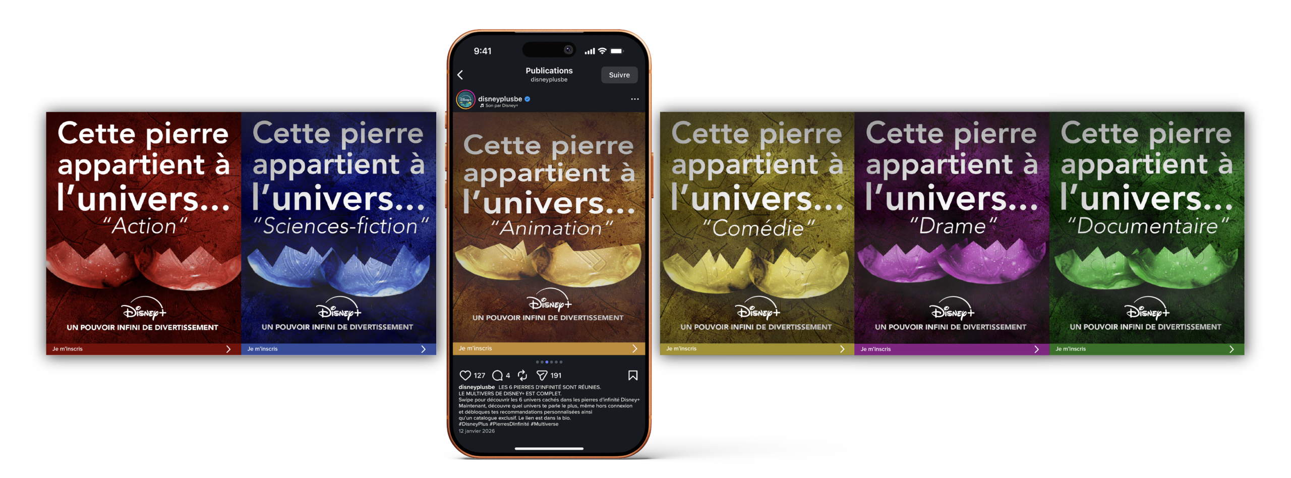 Création d’une campagne de recrutement pour Disney+, diffusée sur les réseaux sociaux, ayant pour objectif d’augmenter les inscriptions à la plateforme. La campagne s’appuie sur un levier issu de l’univers Marvel, les pierres d’infinité, utilisées comme métaphore pour représenter la diversité des catégories disponibles sur Disney+, au-delà du seul univers Disney. Elle se déploie sur les réseaux sociaux et intègre une activation digitale, pensée selon le principe du tunnel de conversion, afin d’accompagner l’utilisateur de la découverte des univers jusqu’à l’inscription.