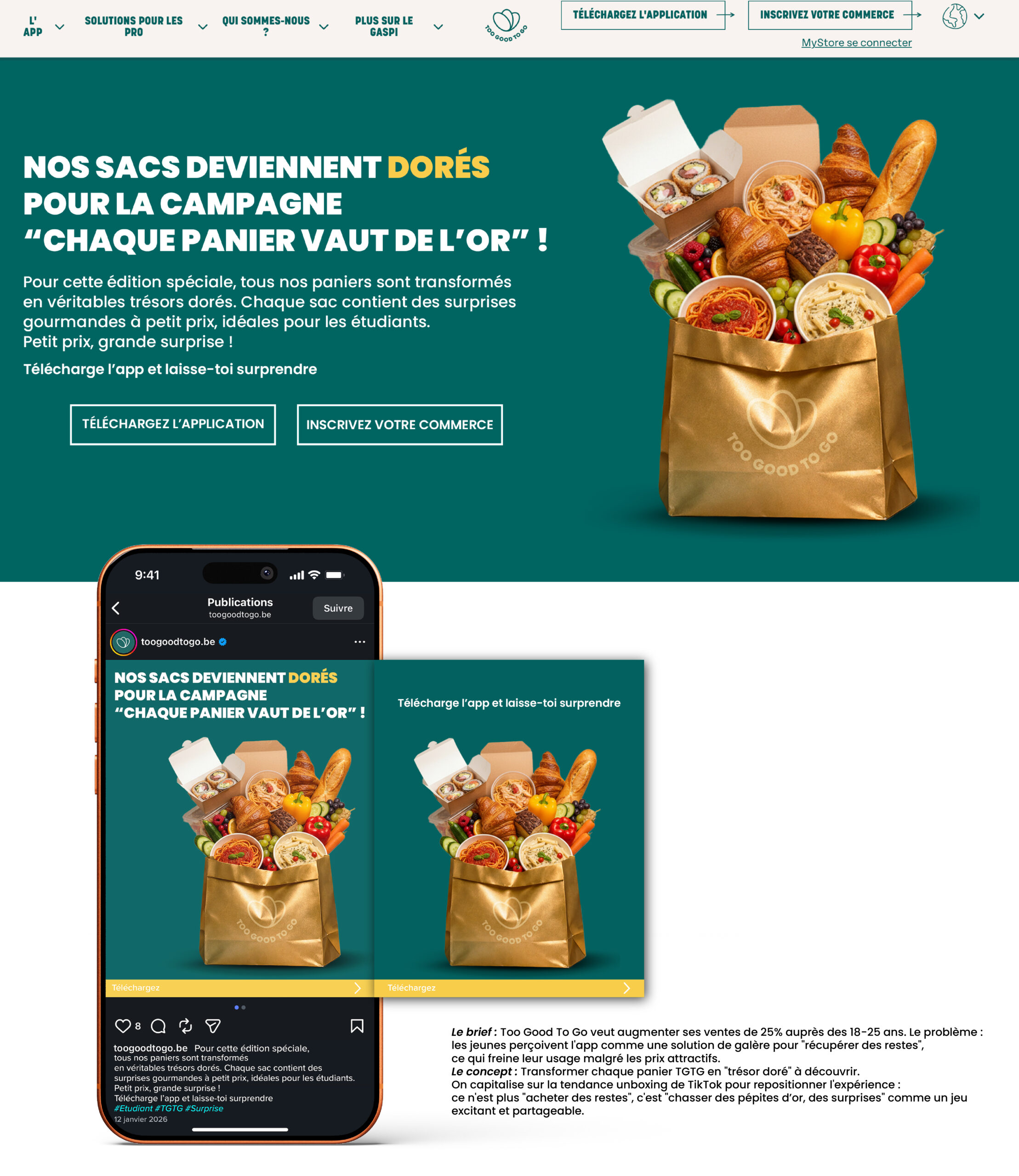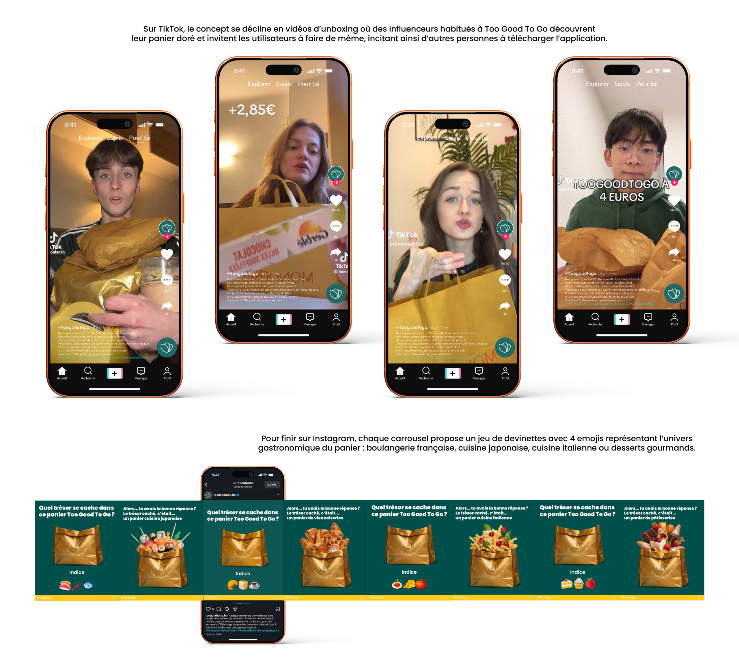 Création d’une campagne digitale et print pour Too Good To Go, visant à augmenter le nombre d’inscriptions sur la plateforme et les ventes, en s’adressant principalement à un public étudiant. Le concept s’articule autour de la surprise des paniers, dont le contenu reste inconnu, et transforme cette expérience en véritables “trésors” grâce à des sacs dorés spécialement conçus pour la campagne. La stratégie mêle affichage urbain ciblé, contenus Instagram et TikTok avec unboxing, et un ton jeune et complice, afin de créer de l’engagement et renforcer la notoriété de la marque.