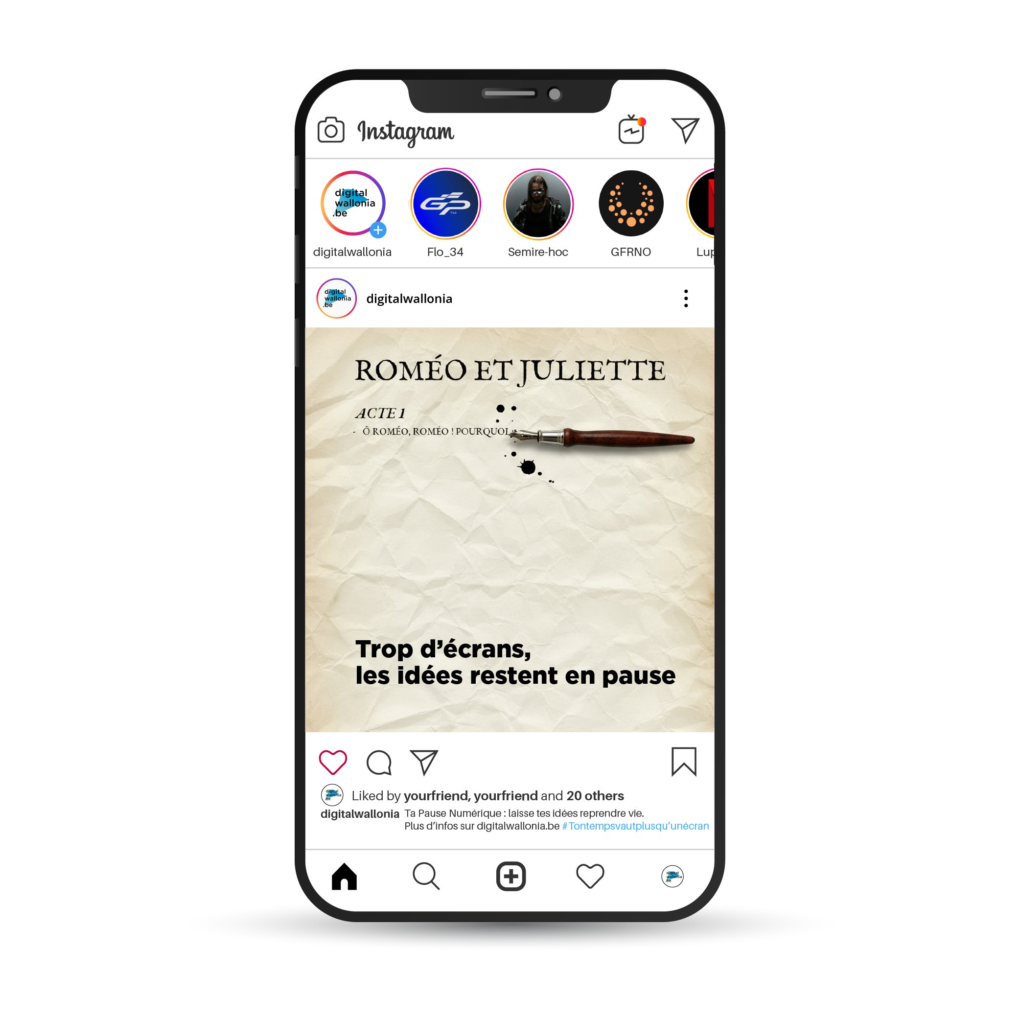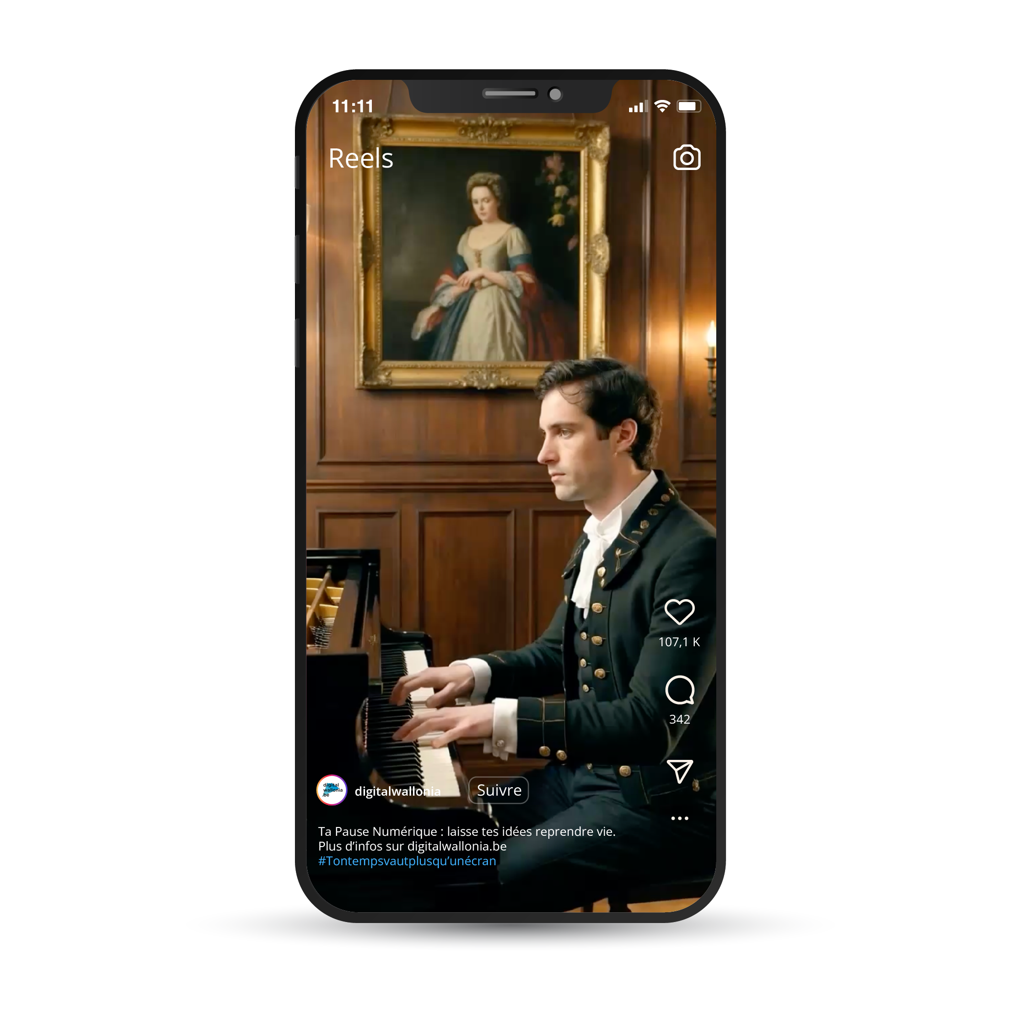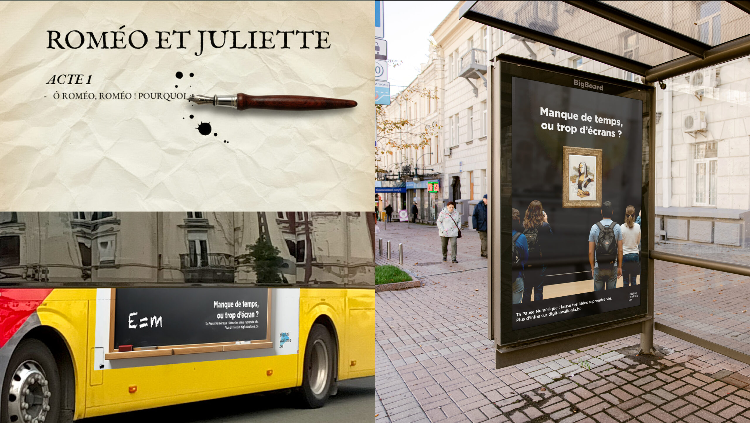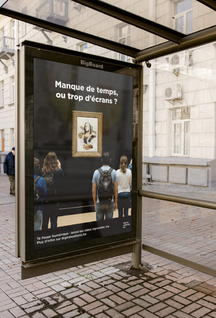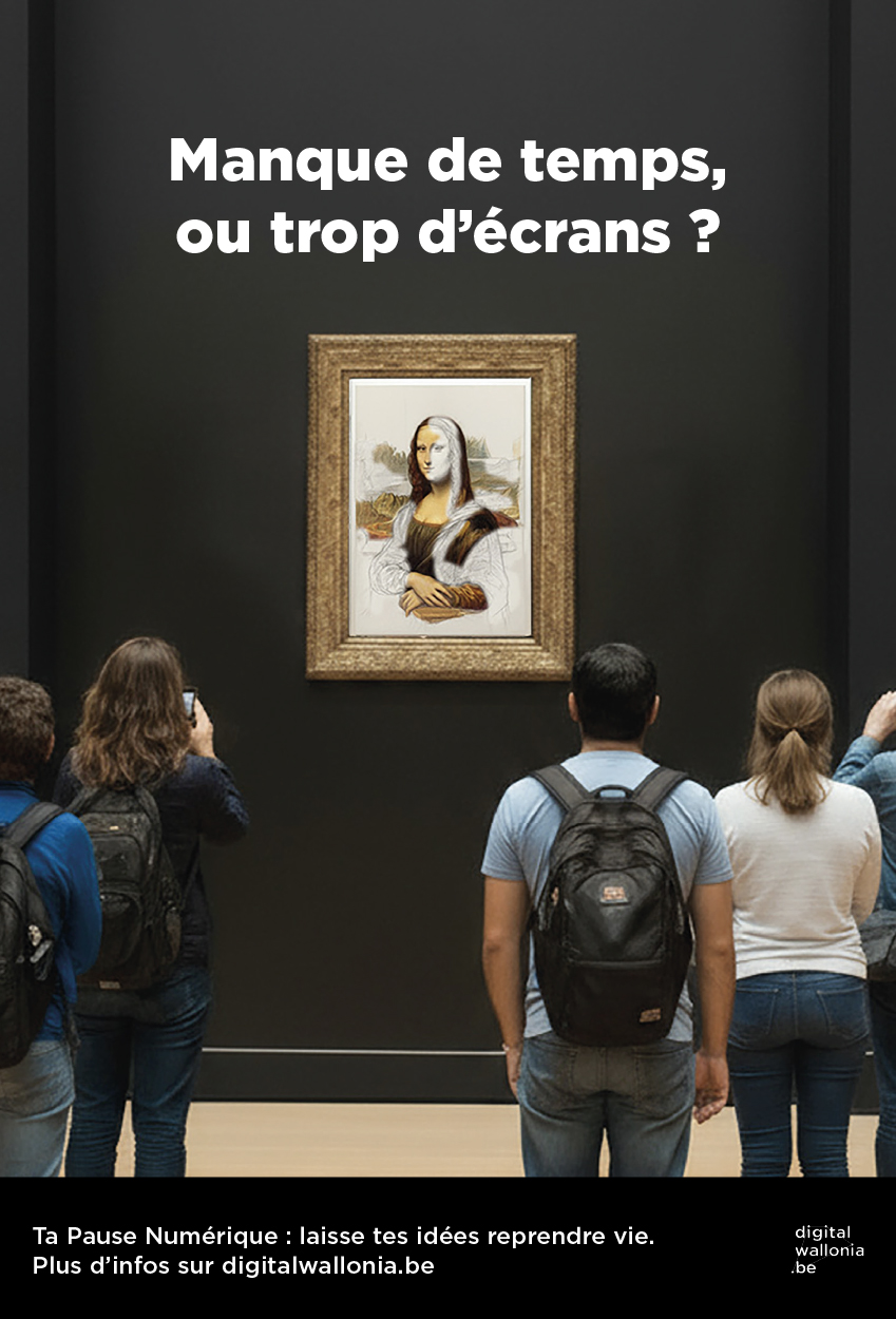 La campagne “Pause Numérique” de Digital Wallonia vise à sensibiliser les jeunes aux effets d’un usage excessif des écrans en valorisant les bienfaits d’une pause digitale. Cette campagne print et digitale, à la fois humoristique et percutante, se base sur un concept fort imaginé : si les grands personnages du passé avaient passé leur temps sur les écrans, ils n’auraient pas pu accomplir leurs œuvres majeures, soulignant l’importance de se déconnecter pour se concentrer et créer.